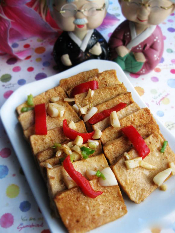 1.千頁豆腐和紅椒準(zhǔn)備好